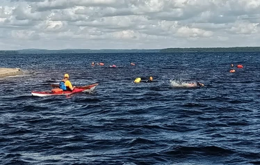 We want the open water swimming event to be a memorable experience in the stunning landscapes of Äirjä Island, and we will make stops (4) at various beaches around the island. Participants will have the option to board a safety boat at any point during the swim or take a ride for part of the distance. All open water swimmers will receive a commemorative award from Äirjä Island. The start and finish areas are located at Vierasniemi on Äirjä Island, which was once a vacation spot for the management and guests of the Kajaani Paper Factory.